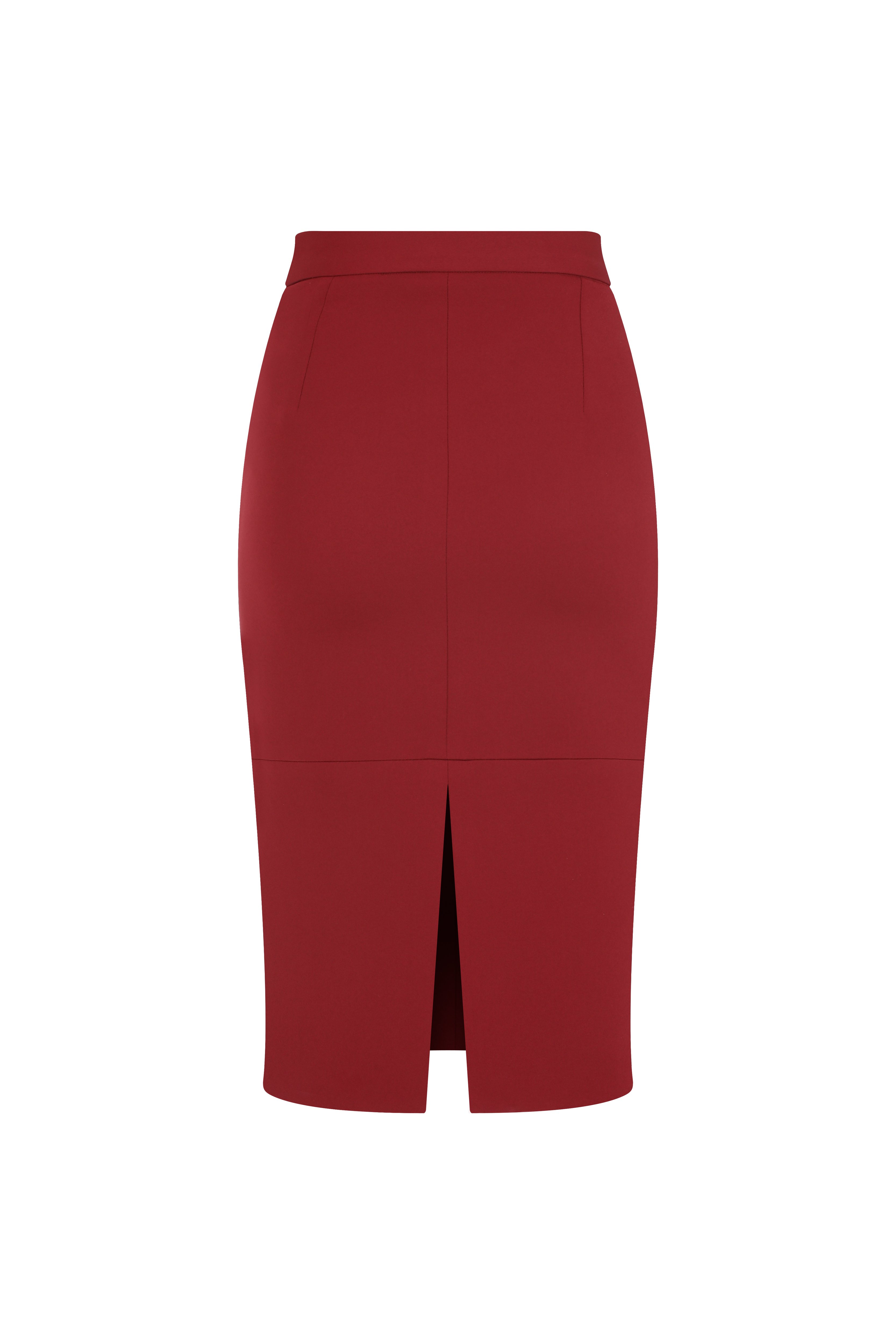 ALVINA SKIRT, minimal çizgilerle güçlü bir duruş sunan, vücuda oturan formu ve dengeli dikiş detaylarıyla modern kadın stilini yansıtır. Bordo rengin derin ve sofistike tonu, likra krep kumaşın pürüzsüz yüzeyiyle birleşerek zamansız ve iddialı bir görünüm oluşturur.