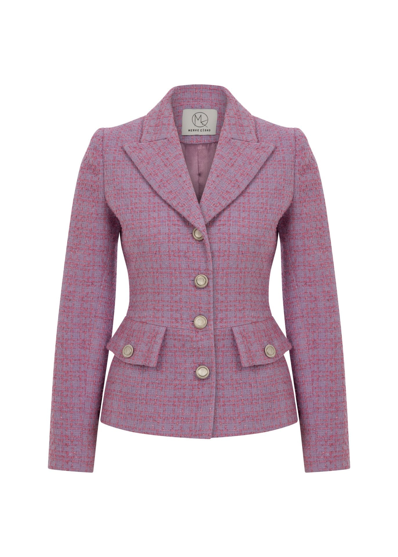 Tasarım DetaylarıCeket: Pensli ve tam fit formu, bedeni zarifçe sarar. Önde yer alan 4 adet gold düğme, lilanın romantik tonuyla mükemmel uyum sağlayarak klasik ve sofistike bir görünüm oluşturur.