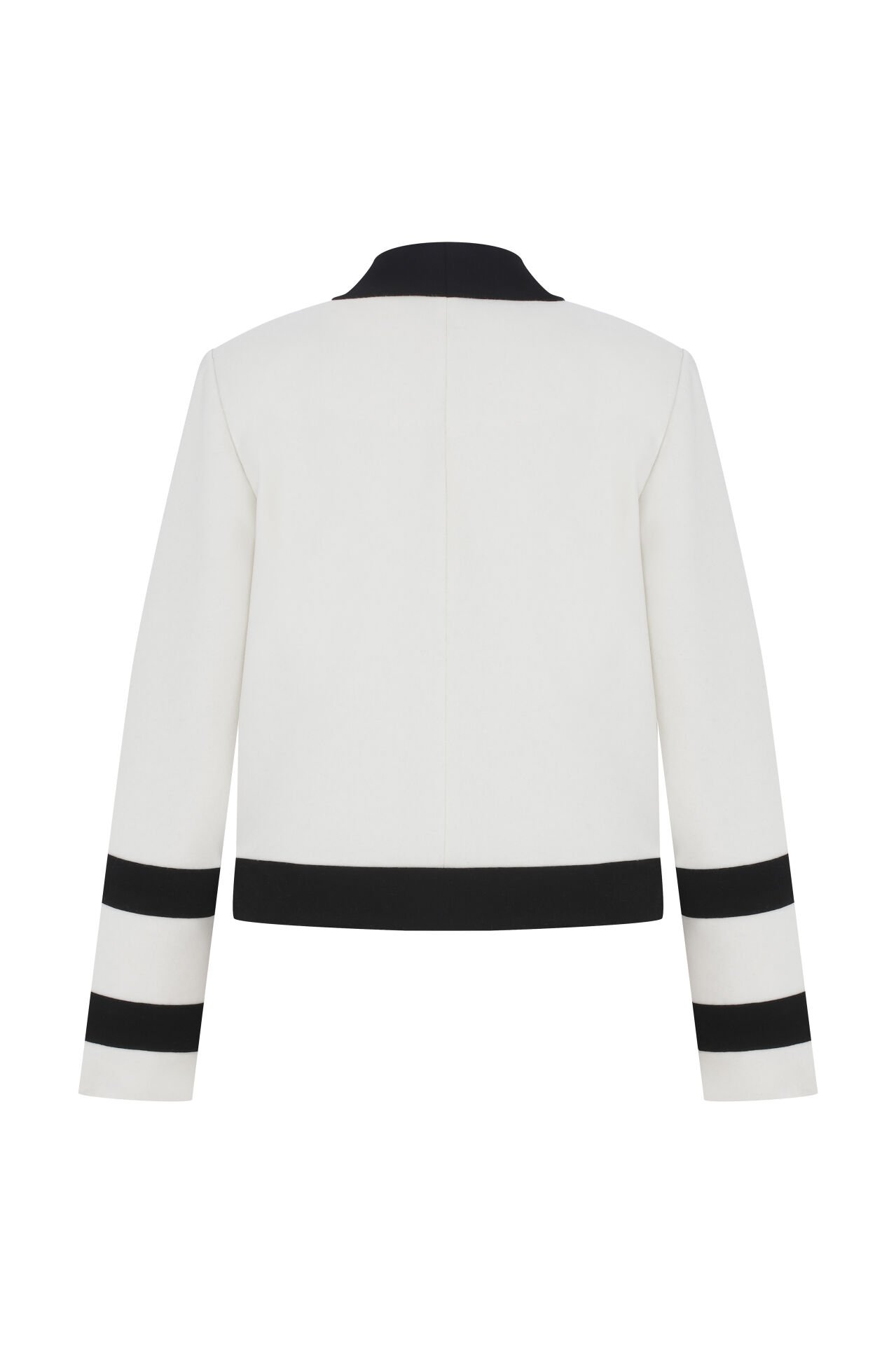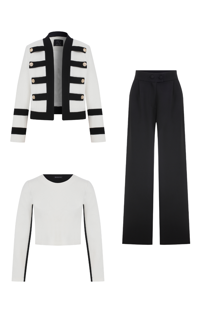 Modelin merkezinde yer alan kısa ceket, ekru zemin üzerine yerleştirilmiş siyah biyelerle çevrelenen dekoratif şeritlere sahiptir. Her bir şerit üzerinde gold renkte metal düğmeler bulunur. Yaka ve ön pat hattında kullanılan geniş siyah biyeler, ceket siluetine net bir çerçeve kazandırır. Kolların sonuna kadar uzanan siyah detaylar, tasarımın bütünlüğünü pekiştirirken, sade arka panelle denge sağlanır.