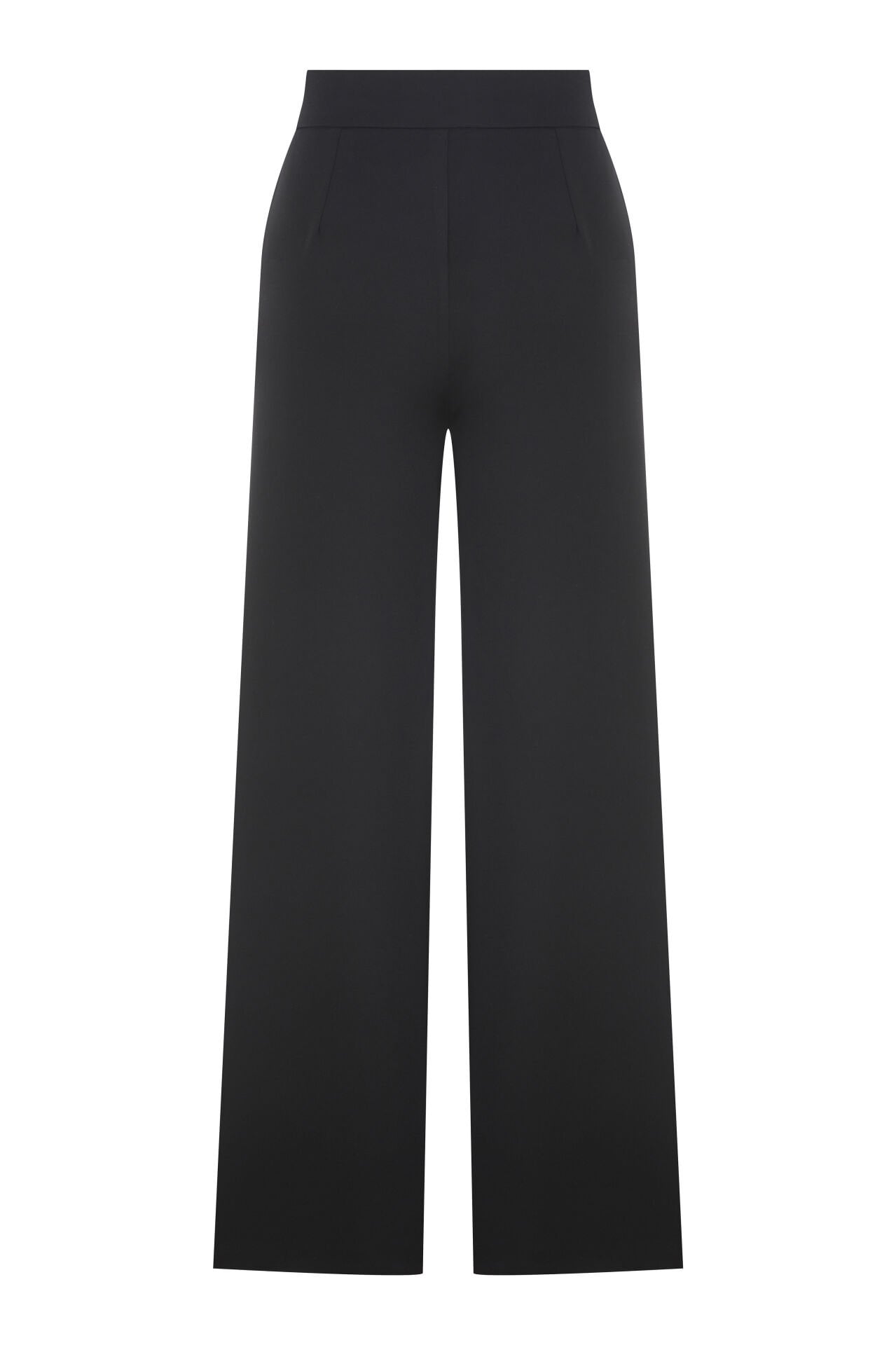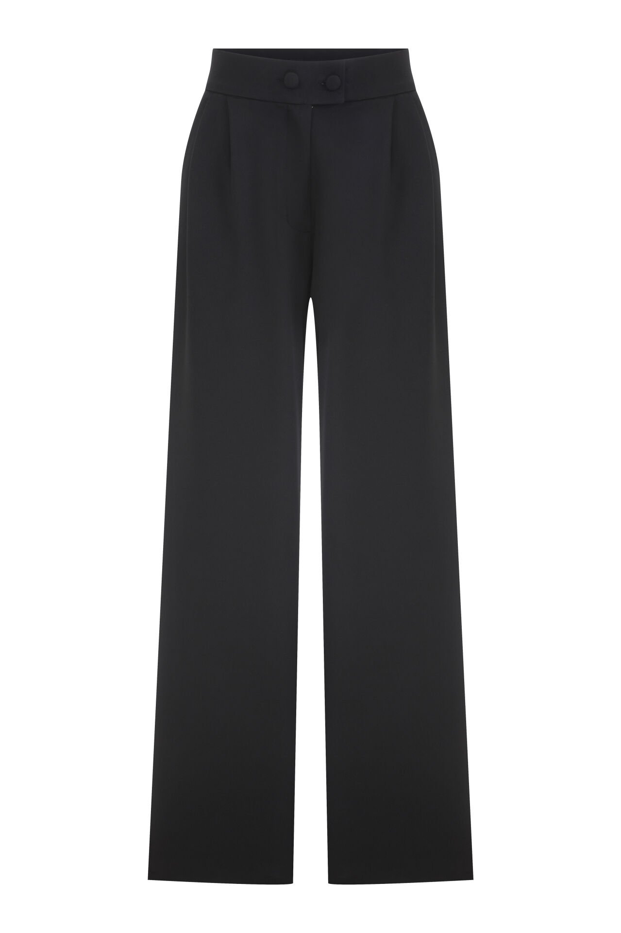 Pantolon: Siyah renkte, bol paça ve yüksek bel. Ön kısımda çift kaplama düğme detayı. Kumaş: Likralı krep.