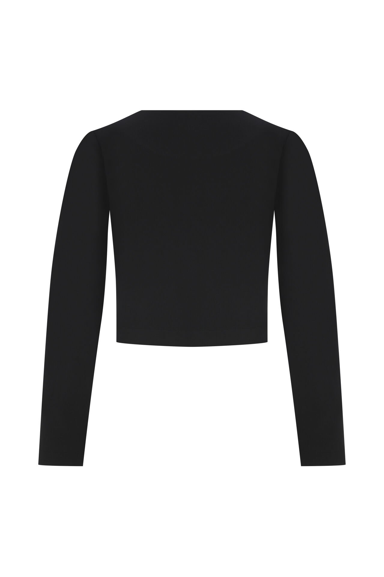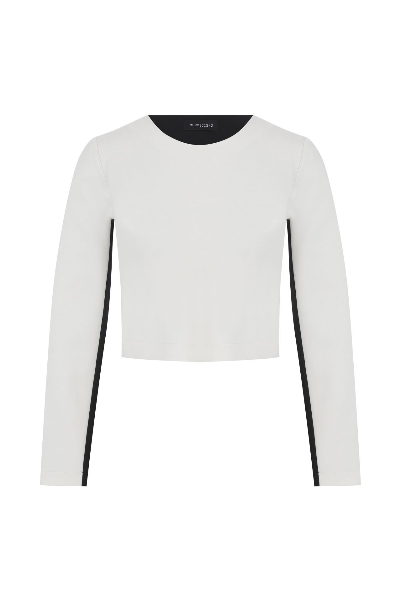 Takımın iç parçası olarak yer alan basic crop bluz, önü ekru ve arkası siyah olmak üzere iki farklı renk bloğundan oluşur. Yuvarlak yakalı, uzun kollu ve vücuda oturan bu triko parça, hem rahatlığı hem de minimal şıklığı bir araya getirir.