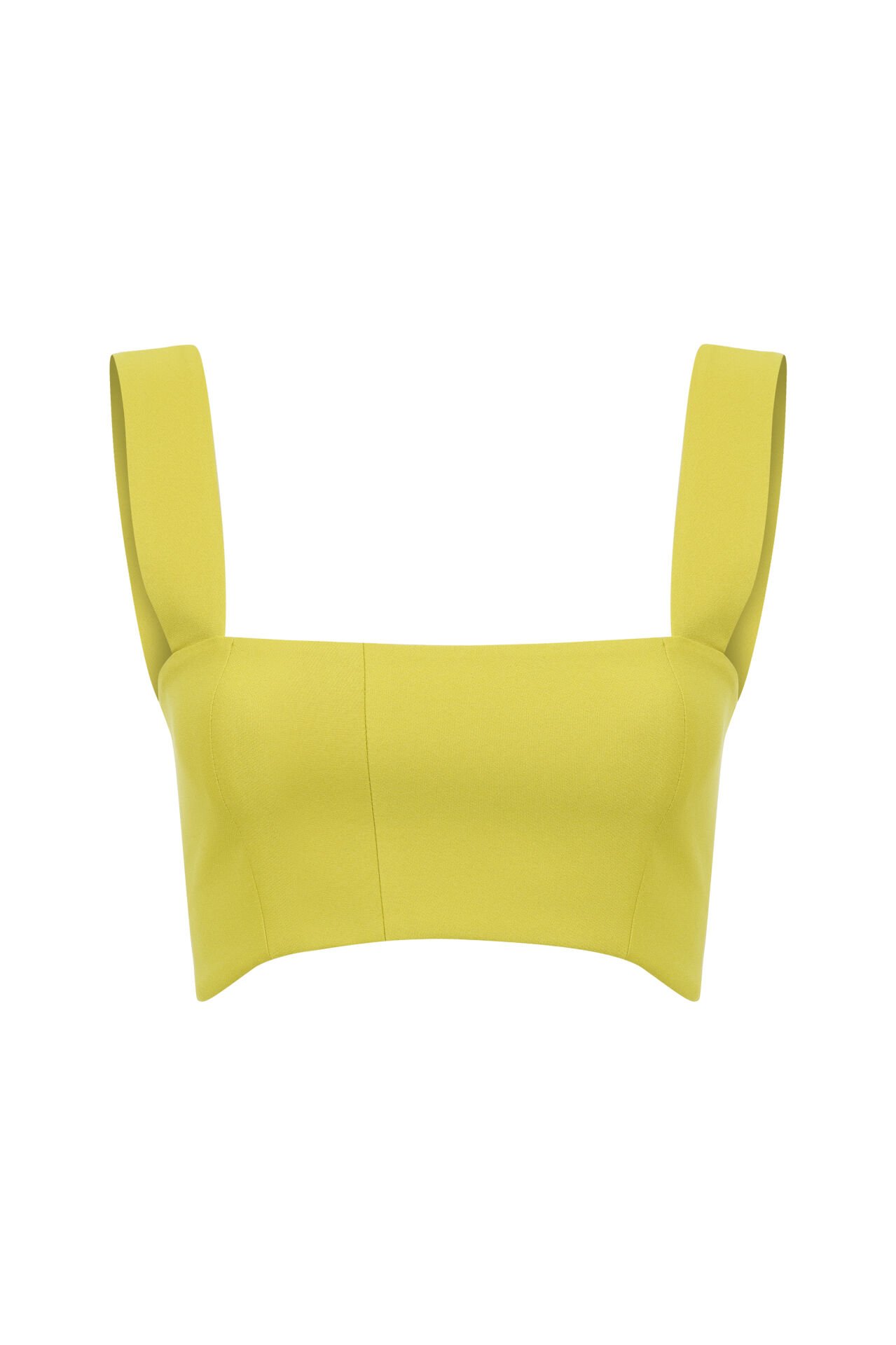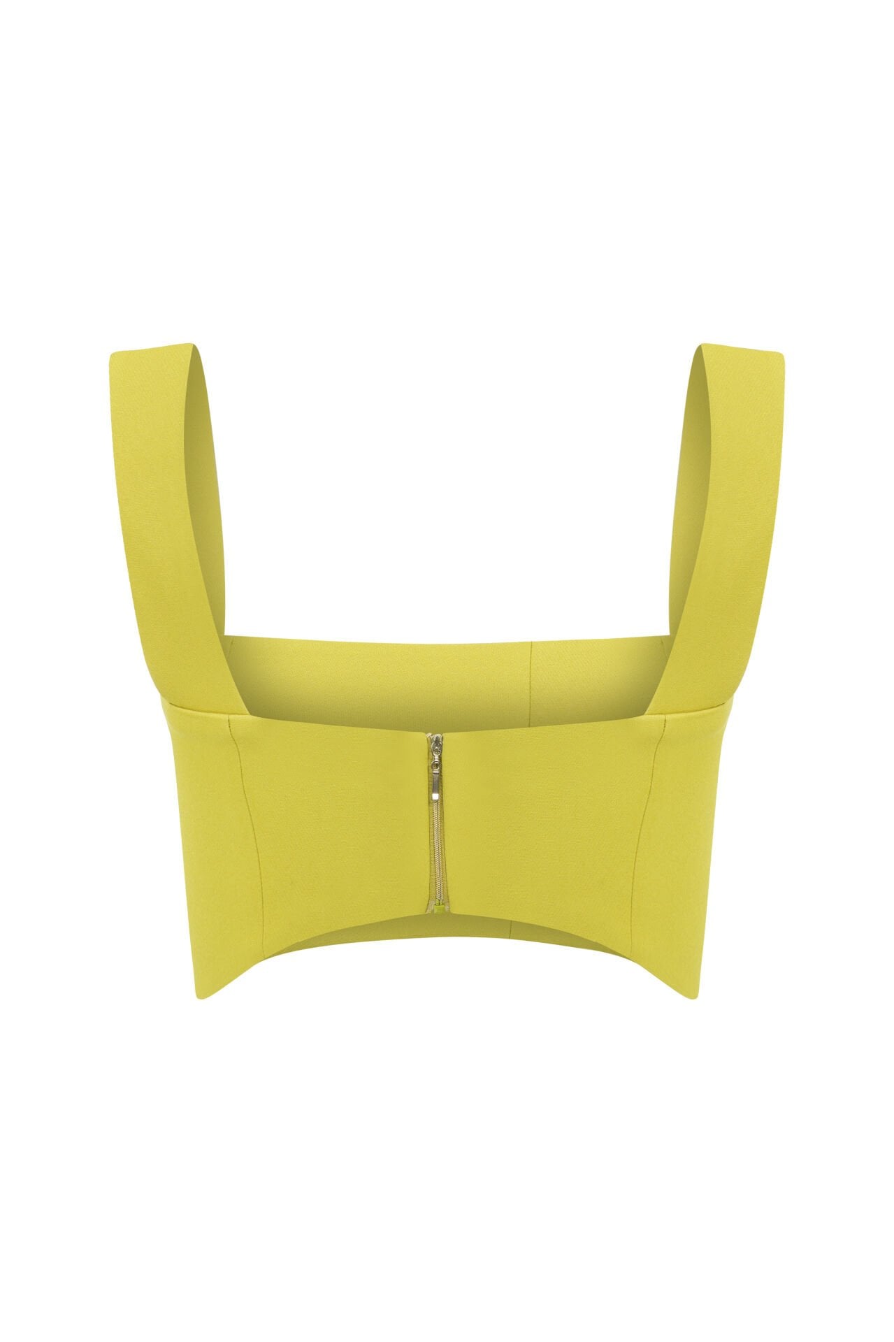 Crop üst, ön kısmındaki ince dikiş detayıyla zarif bir dokunuş sunarken, arka fermuarı sayesinde kolay giyilip çıkarılabilir.