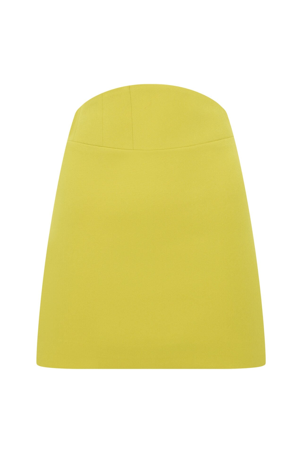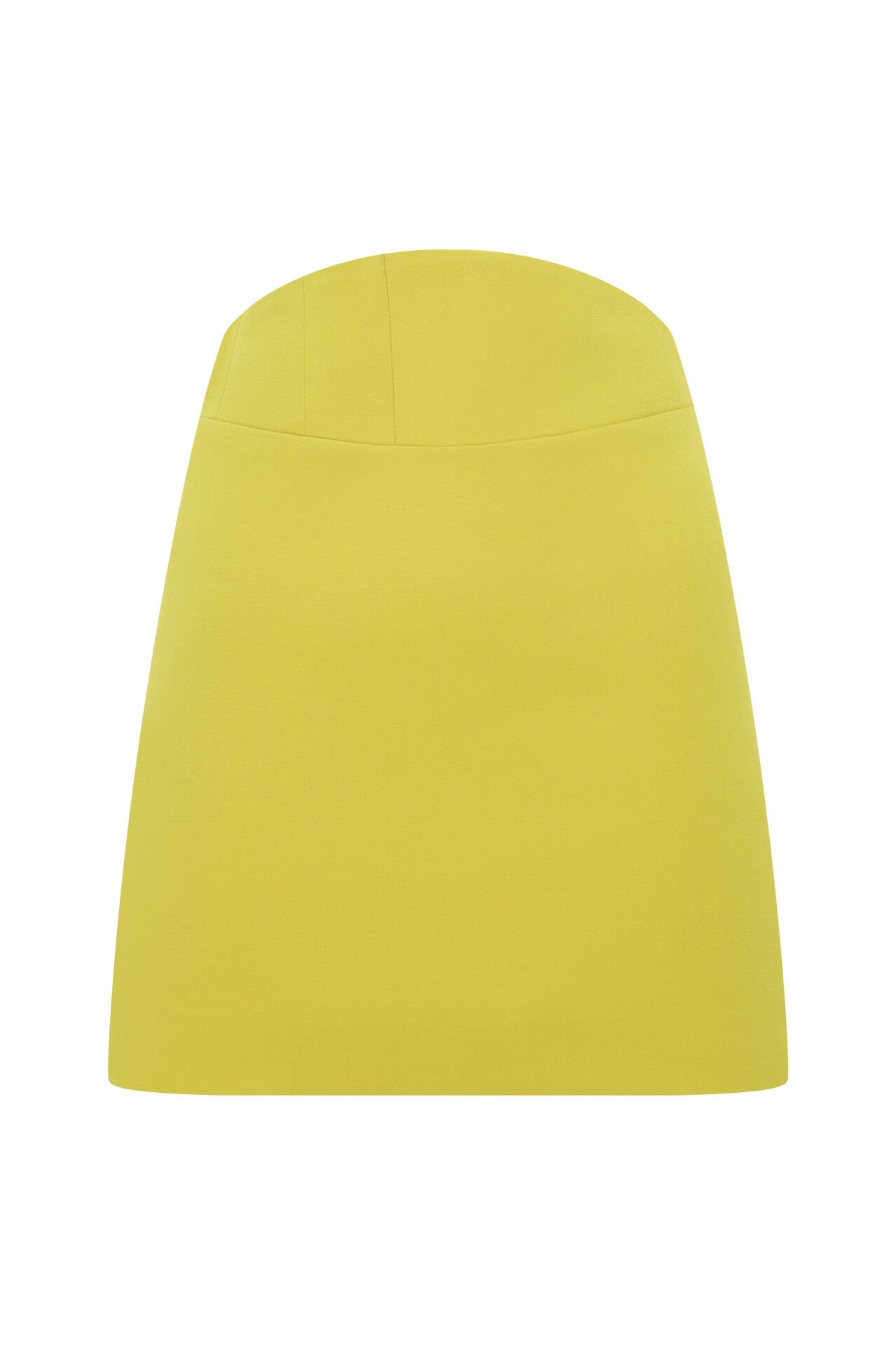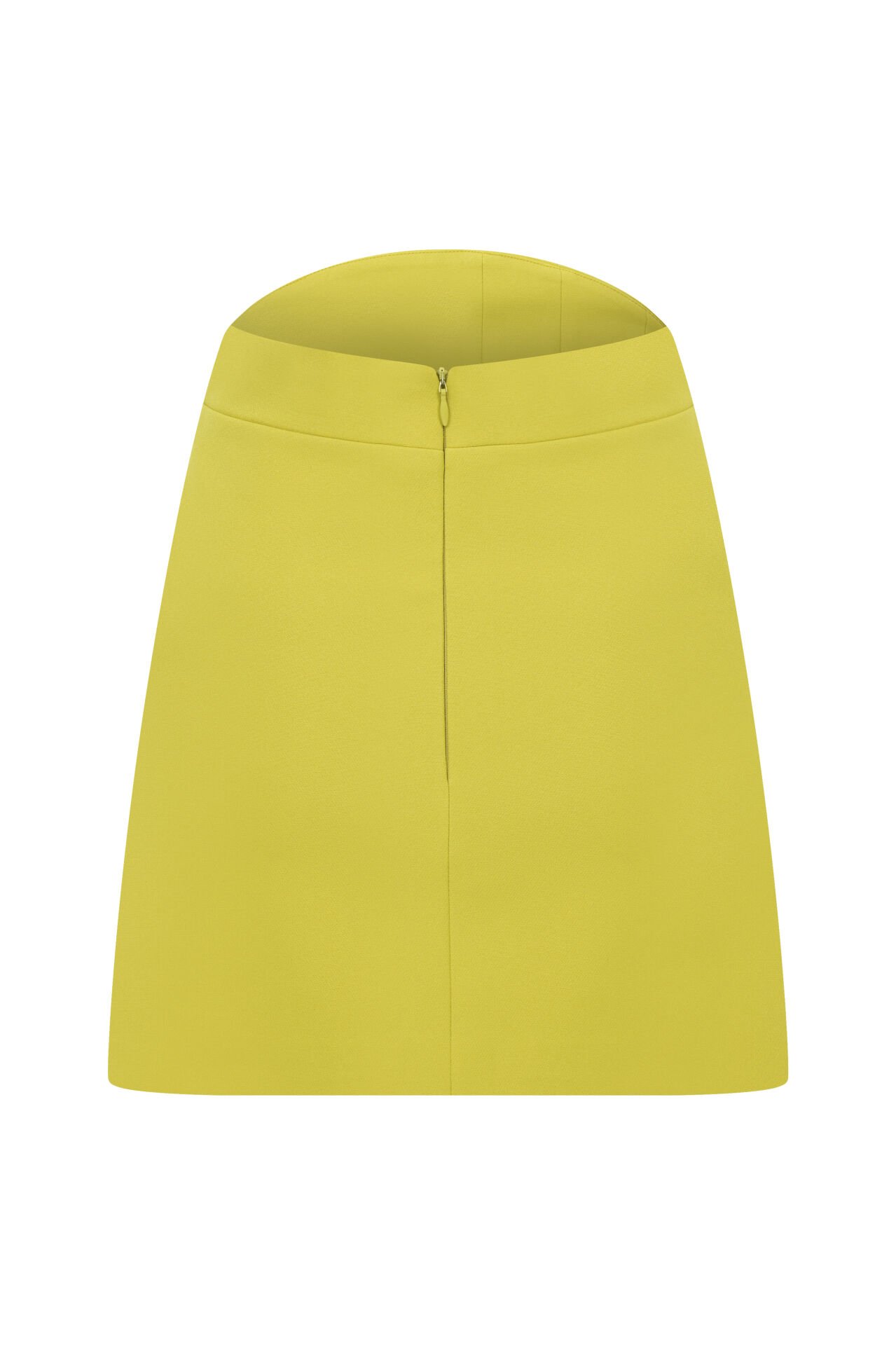 Etek, öndeki dikiş detayıyla takımın modern çizgisini tamamlar.