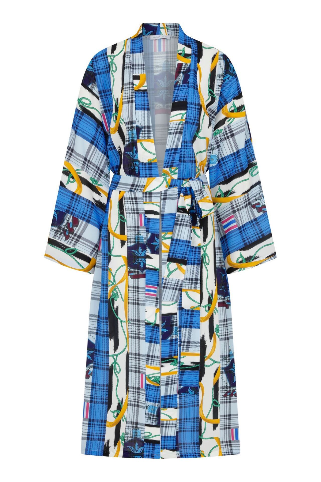 TANGO KIMONO, mavi tonların enerjisini klasik ekose deseni ve altın zincir motifleriyle birleştirerek cesur ama dengeli bir görünüm sunuyor. Özgün desen yapısı ve dökümlü kalıbıyla yaz aylarında rahat ama stil sahibi bir duruş isteyenlerin vazgeçilmez tercihi olmaya aday.